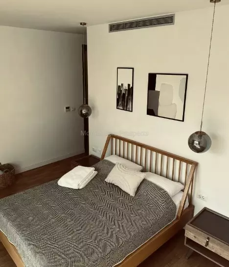 - Ground floor: A bright and spacious open-plan living area with a kitchen, fireplace, and high ceilings. Floor-to-ceiling windows flood the space with natural light, creating a warm and inviting atmosphere. The interior is custom-built in a refined, luxurious style.