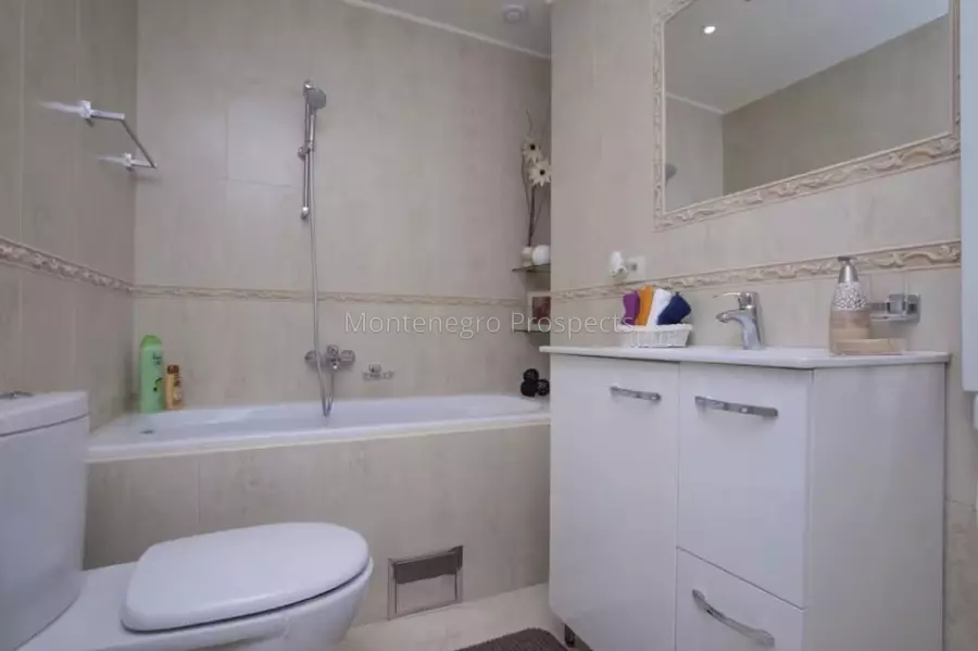 This charming three-bedroom apartment is located in a modern building with a shared pool and a private garage in Prcanj.