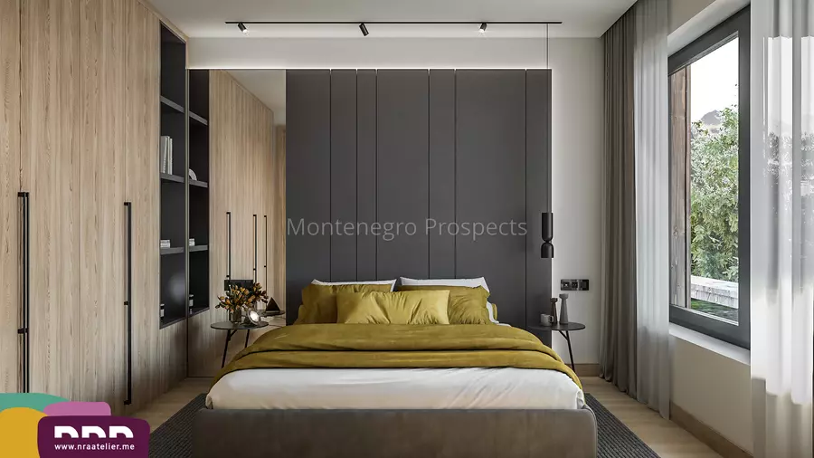 In the southern area, in the first row of the site, four spacious houses will be built. The first floor is located at the back of the slope, which facilitates temperature regulation. On a living area of 147.2 sqm there are three bedrooms and an open living area. From each of these rooms you can enjoy the view into the distance. The entrance with wardrobe is located on the slope side halfway between the floors. As you walk down, the spacious living-dining area opens up with an elegant fitted kitchen and counter. At a total width of about 6 meters the floor-to-ceiling windows offer you a magnificent view of the landscape as well as two exits onto the terrace and into the garden.